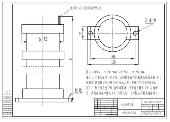 6、串接于交流6~35KV非有效接地系統(tǒng)PT一次繞組中性點與地之間,在一個系統(tǒng)中接有多臺電壓互感器時,應(yīng)每臺互感器的三相高壓繞阻中性點裝一臺消諧器, 才能有效地限制弧光接地過電壓和消除鐵磁諧振。
